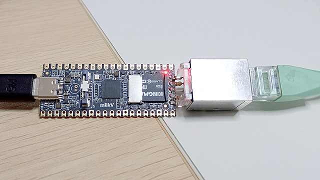 ファームウェアを書き込んだ Milk-V Duo をPCにUSB接続すると、約1分くらいで起動し、青色のLEDが点滅します。このときPCは、USB接続のネットワークアダプタ(CDC-NCM)として Milk-V Duo を認識します。