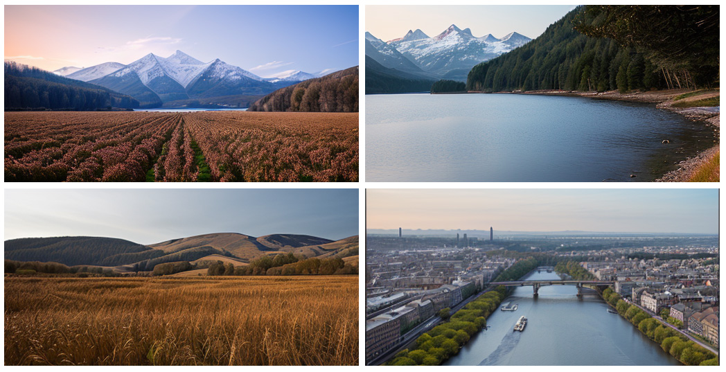 下図は Stable Diffusion の基本モデル SD1.5 による生成例です。画像1枚の解像度は512×256です。1枚につき約6分の生成時間を要しました。基本モデルなので見劣りします。とはいえ、フォトフレームに表示する風景画であれば、利用可能な範囲でしょう。