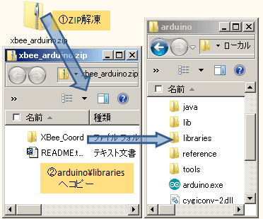 Arduinoへ書き込むソフトウェアのインストールを行います。まず、当方サイトのダウンロードページからXBee用ライブラリ(xbee_arduino.zip)をダウンロードします。ダブルクリックするとZIP圧縮されたファイルが見えます(下図@)ので、「XBee_Coord」フォルダを、Arduino IDEの「libraries」フォルダにコピーします(下図A)。
