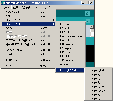 Arduino IDEの「ファイル」メニューから「スケッチの例」「XBee_Coord」を選ぶと、サンプルアプリケーションが表示されます。ここでは「sample4_sens」を選んでみてください。