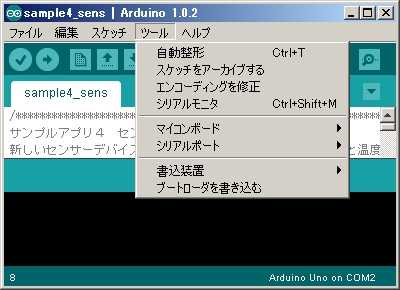 Arduino IDEの必須の設定は2つだけです。「ツール」メニューにある「マイコンボード」と「シリアルポート」です。「マイコンボード」は購入したArduinoの種類を選びます。Arduino Unoであれば「Arduino Uno」です。「シリアルポート」はArduinoと通信を行うためのCOM番号を選びます。分からない場合は、適当に選んでおいて、動かなければ変更します。