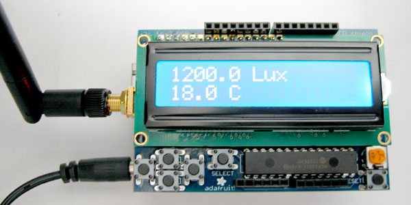 下図はワイヤーアンテナのXBee-PROが載ったArduino Wireless Shieldの上にadafruit LCD Shieldを装着した状態の完成図です。左からアンテナが飛び出ているのが分かります。