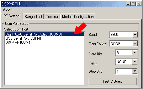設定には先ほどインストールした「X-CTU」を使用します。起動すると下図のようなシリアルポートの選択画面になりますので、XBeeの接続されているシリアルポート(COM番号)を選択します。どれか分からない場合は、選択して「Test / Query」を押せば確認できます。