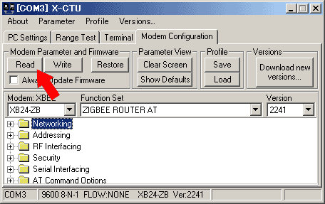 次に上方にあるタブの中から「Modem Configuration」を選択し、「Read」をクリックします。うまくシリアル通信が出来れば、XBeeモジュールの設定値が表示されます。シリアル通信が動作しない場合は、前述のXBeeリセットや空スケッチを試します。