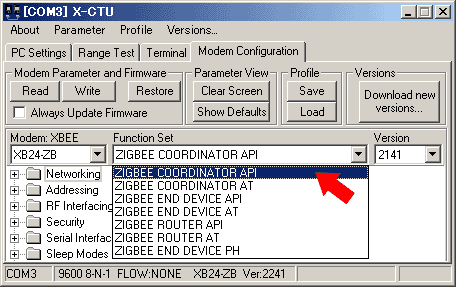 ファームウェアの種類「Function Set」をプルダウンして「ZIGBEE COORDINATOR API」を選択します。語尾に「API」のついたものと「AT」のついたものがありますが、ここでは必ず「API」を選択してください。